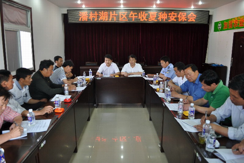 530下午,安徽省明光市潘村湖片区午收夏种安保联席会议在潘村湖农场举行。潘村镇政府及相关行政村、潘村派出所主要负责人和潘村湖农场副场长孙华存及相关科室、各农管区、种子公司负责人参加了会议。