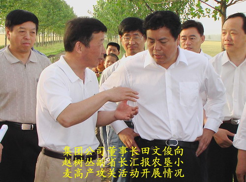2008年5月28日下午,安徽省委常委、副省长赵树丛在省农委、宿州市委市政府、省农垦集团公司等领导的陪同下,到安徽农垦夹沟农场检查小麦高产攻关活动的开展情况。赵副省长一行首先听取了该场负责人关于近年来开展小麦高产攻关活动的具体落实情况汇报。在听完汇报后,赵副省长对该场在农业生产中采取的“五统一”管理模式,在高产攻关活动中率先在全省取得小麦单产600公斤大关等成绩给予了高度赞扬,同时还提出了许多栽培管理方面的技术问题。特别是当他得知并目睹该场小麦单产在超过600公斤而不出现倒伏现象时,兴致盎然地询问了一些栽培方面的具体措施,并随即告诉随行人员,要积极向全省广大农民朋友宣传推广夹沟农场小麦高产栽培技术,使他们在生产中学懂会用进而产生效益,加快致富奔小康步伐。最后,赵副省长勉励省农垦及夹沟农场要及时总结小麦高产攻关经验,积极探索小麦高产栽培规律,推广普及小麦高产栽培技术措施,充分发挥农场在社会主义新农村建设中的示范带动作用,为我省农业的发展做出应有的贡献。