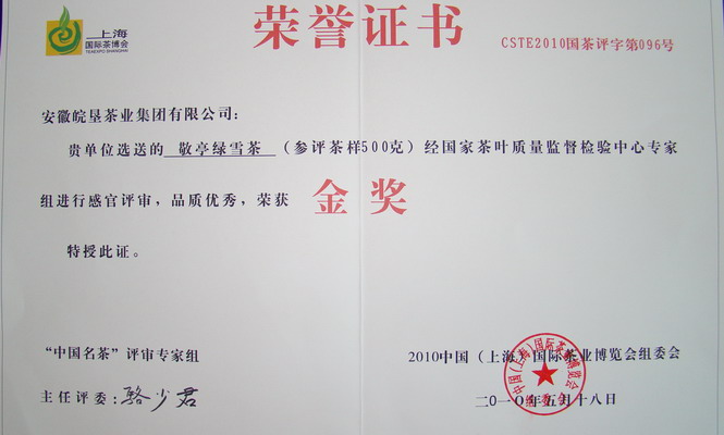 在皖垦茶业集团组建伊始、2010年春茶初战告捷之际,从2010中国(上海)国际茶业博览会上又传来喜讯——敬亭绿雪膺誉中国名茶评比“金奖” !这是皖垦茶业集团实施品牌发展战略取得的又一新的重要成果。