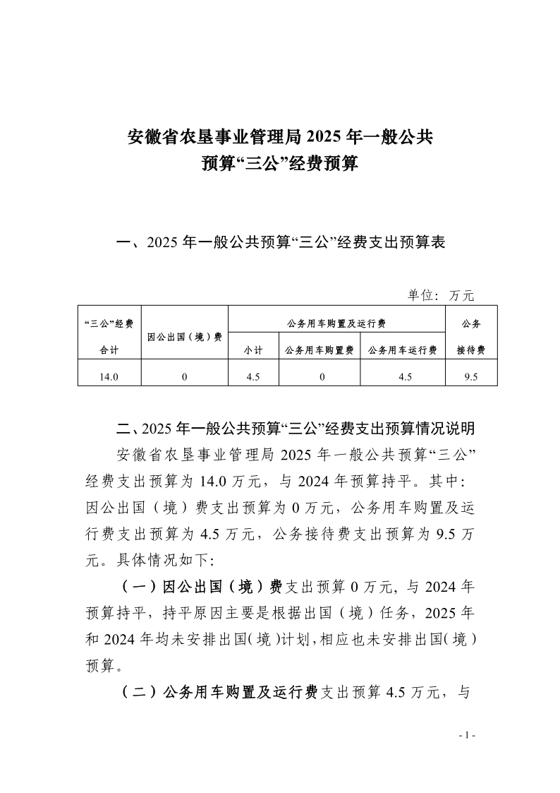 安徽省农垦事业管理局2025年一般公共预算“三公”经费预算